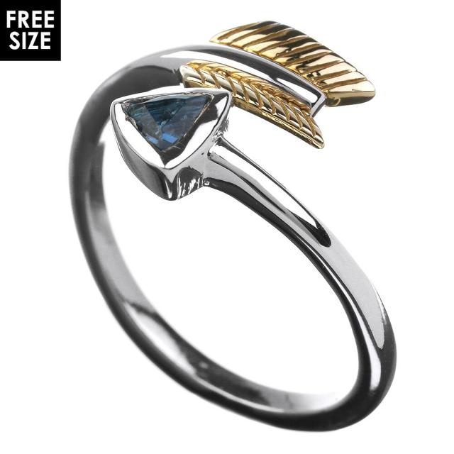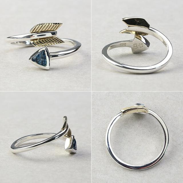 人気のアロー(弓矢)をモチーフに、矢の先にブルートパーズを埋め込んだリング。思わず目を引かれる2重のモチーフと華奢なリング部分とのメリハリを楽しめるデザインとなっています。矢じり部分には真鍮を使用し、コントラストのあるカラーリングに仕上がっています。
