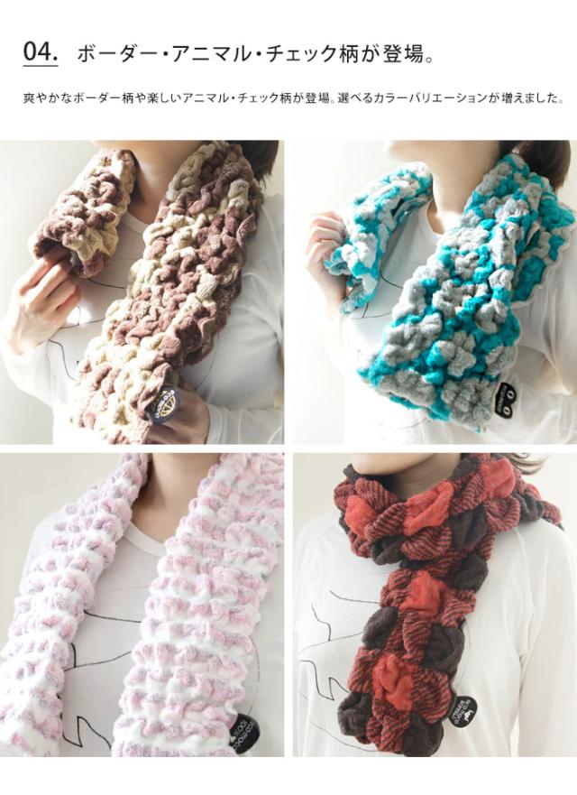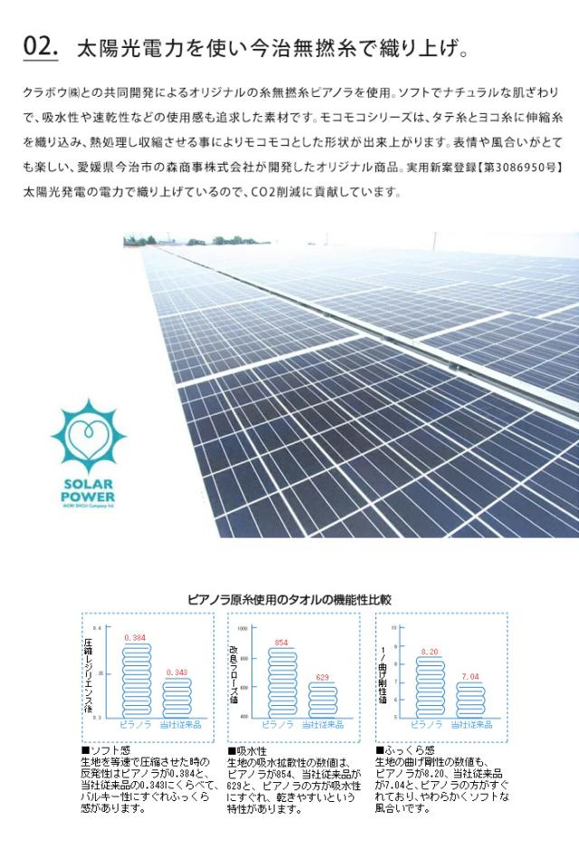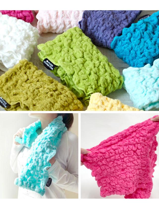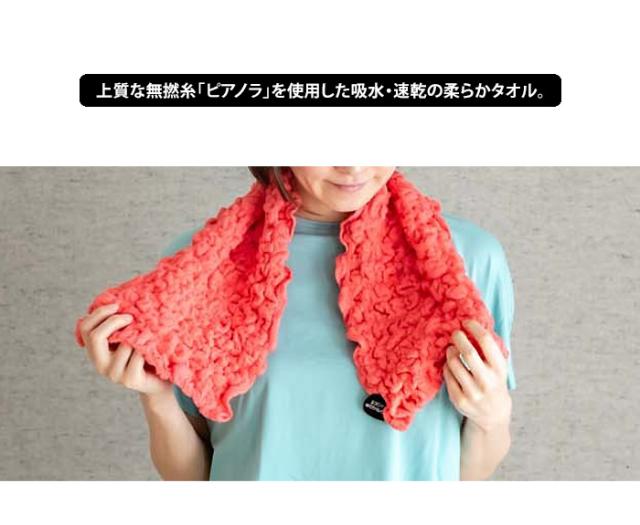 のびのび伸縮するので、巻いても優しくフィット。水分や汗をすばやく吸収してくれ、お風呂上がりやプール後、スポーツタオルとして最適。クラボウとの共同開発によるオリジナルの糸無撚糸ピアノラを使用。吸水性や速乾性などの使用感も追求した素材です。タテ糸とヨコ糸に伸縮糸を織り込み、熱処理し収縮させる事によりモコモコ形状に。太陽光発電で織り上げています。