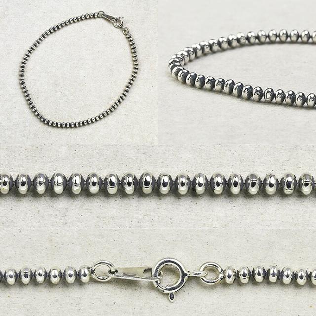 楕円形のボールが繋がったボールチェーンのブレスレット。ボールの側面に燻し加工を施すことで立体感を強調、手首で独特の存在感を放ちます。メンズ用・レディース用の2サイズをご用意。ペアで着けるのもオススメのアイテムです。