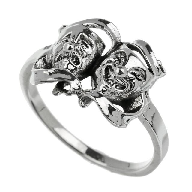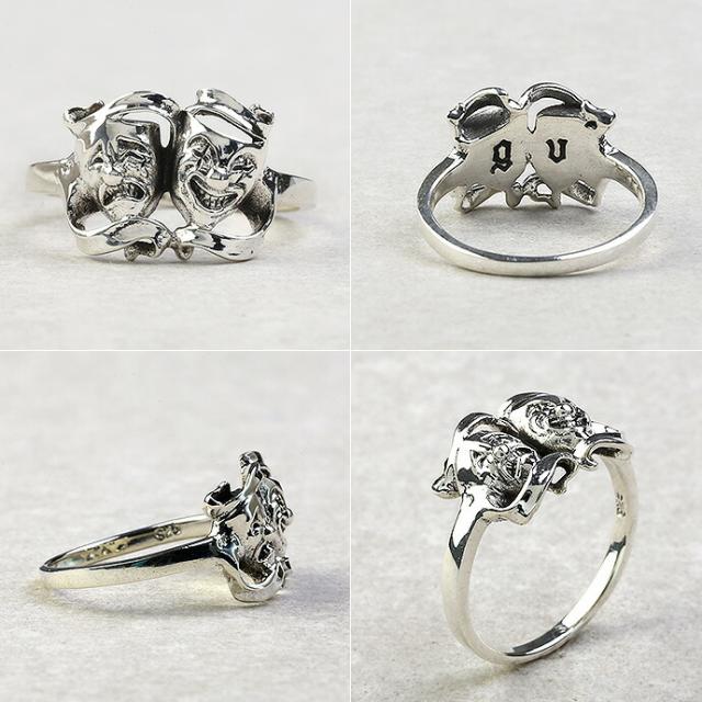 「ツーフェイス」モチーフのシンプルな細めリングです。笑い顔と泣き顔の仮面が並んだ「ツーフェイス」は、古代ギリシャ演劇が由来の「喜劇と悲劇」のシンボル。メキシコ系アメリカ人のチカーノ達の間では「今は笑って、泣くのは後(今を生きるという意味)」という格言を表すタトゥーモチーフとして人気です。