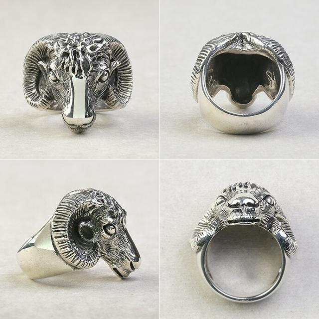 ぐるりと巻いた角が特徴的な、山羊(ゴート)の顔の存在感あふれるリングです。山羊の頭が精密な彫金と燻しによってリアルに作りこまれています。モチーフの裏がくり抜かれているので、程良い重量感でインパクト大なデザインを楽しめます。