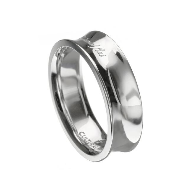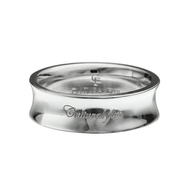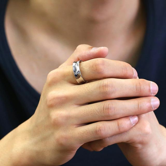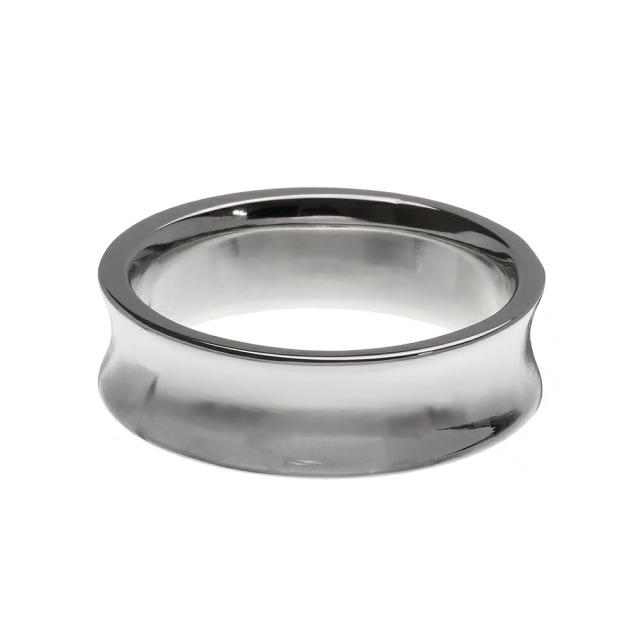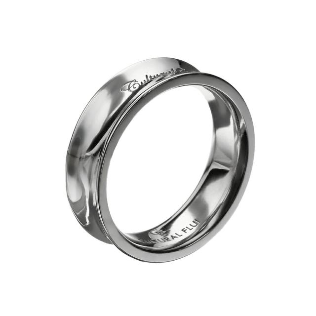 リングの中央にくびれが入ったデザインのリング。プラチナ等によく用いられる仕法・ロジウムコーティングが、高級感のある美しい輝きを生み出します。リングの中央にはFLUIのブランド名をデザイン。内側は角を丸く削った内甲丸仕上げです。FLUIが得意とする美しくなめらかな曲線に、上品さと高級感、大人の余裕を感じさせるアクセサリーです。