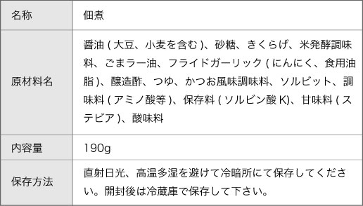 【原材料名】醤油(大豆、小麦を含む)、砂糖、きくらげ、米発酵調味料、ごまラー油、フライドガーリック(にんにく、食用油脂)、醸造酢、つゆ、かつお風味調味料、ソルビット、調味料(アミノ酸等)、保存料(ソルビン酸K)、甘味料(ステビア)、酸味料