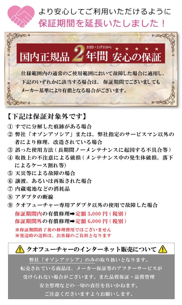 2022年9月の仕様変更以降、 初期不良が極めて少なく、 定期メンテナンスを行っていただいているお客様のもと で、長期にわたる 安定稼働の実績 を積み重ねてきました。 これらの使用実績を 製造メーカーが高く評価 したことを受け、当社(オゾンアソシア)として、 メーカー保証を従来の1年から2年へ延長 し、より安心して、長くお使いいただける体制が整いました。