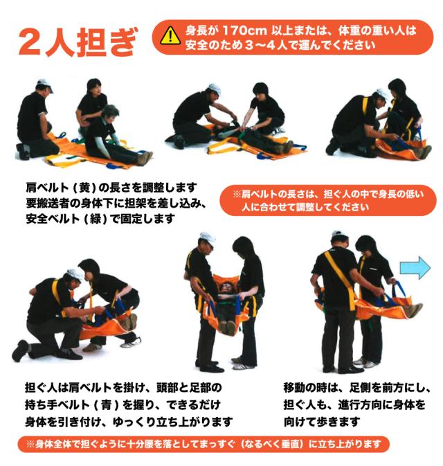 ・1〜2人の担ぎ方は担架に載せて運ぶ人の体重に合わせてお選びください。