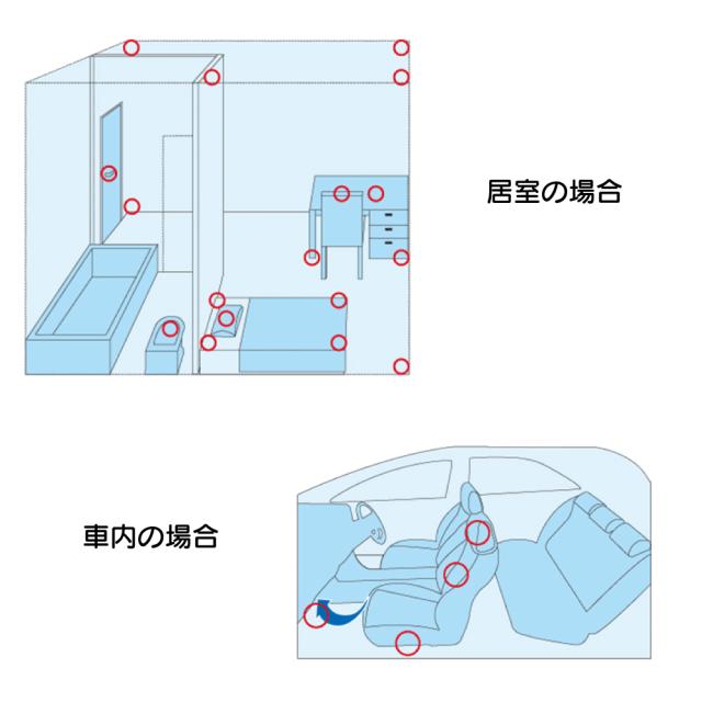 ドアノブ、手すり、衣服、枕、布団、クッション、カーペット、カーテン、電話機、クローゼット、 車のシート・シート下部・トランク・フロアマット、ヘルメット、靴内部、おもちゃ、ペット用品、下駄箱、柔道・剣道着など