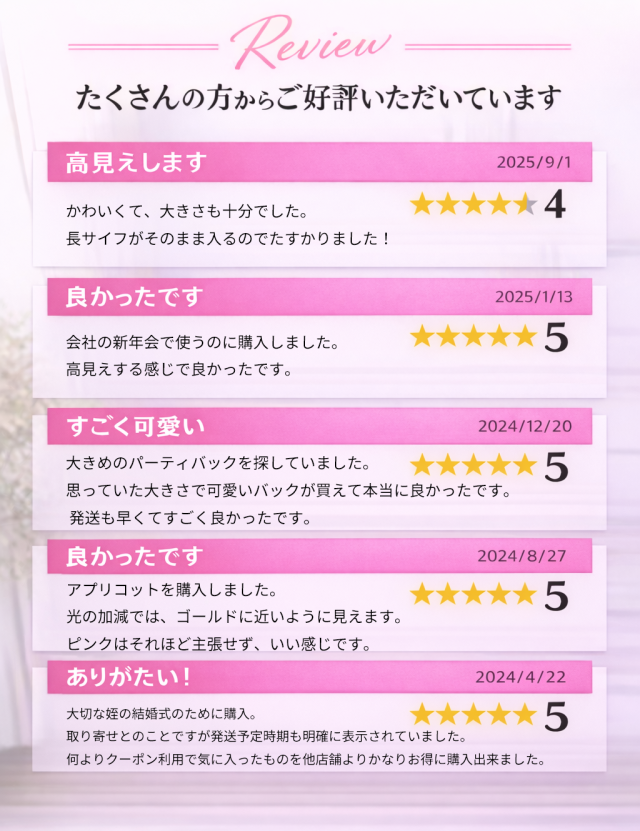- 大きめのパーティバックを探していました。思っていた大きさで可愛いバックが買えて本当に良かったです。 発送も早くてすごく良かったです。
