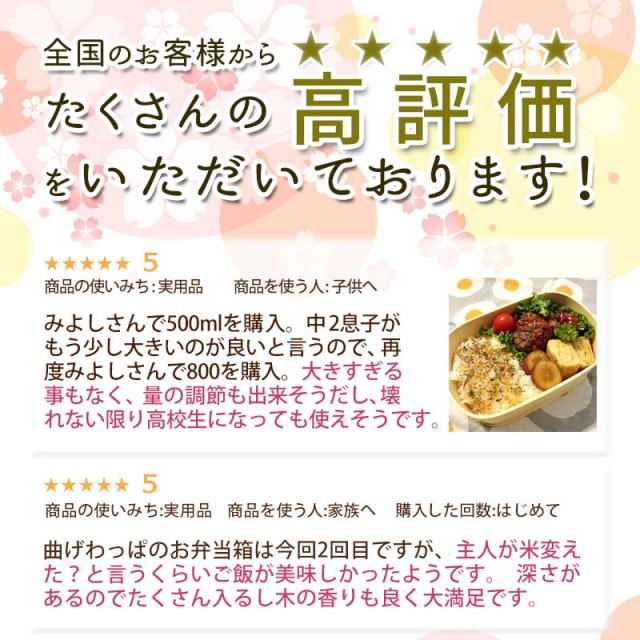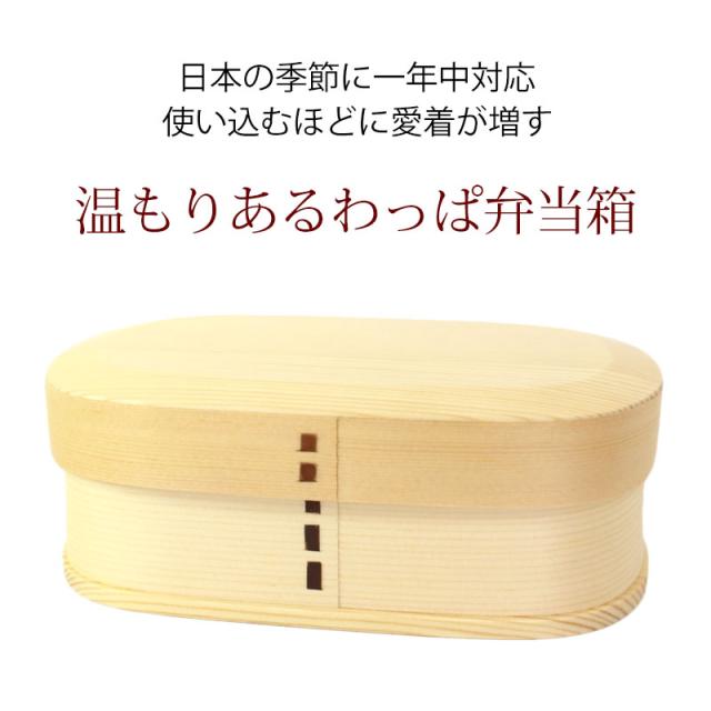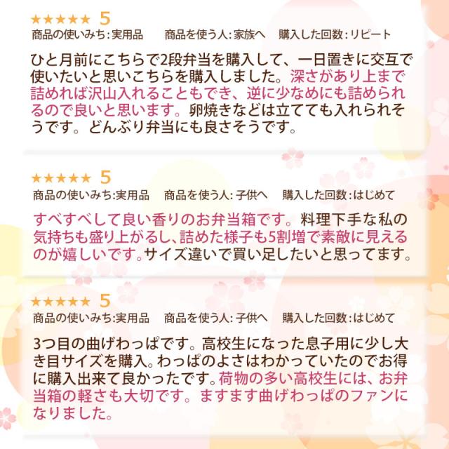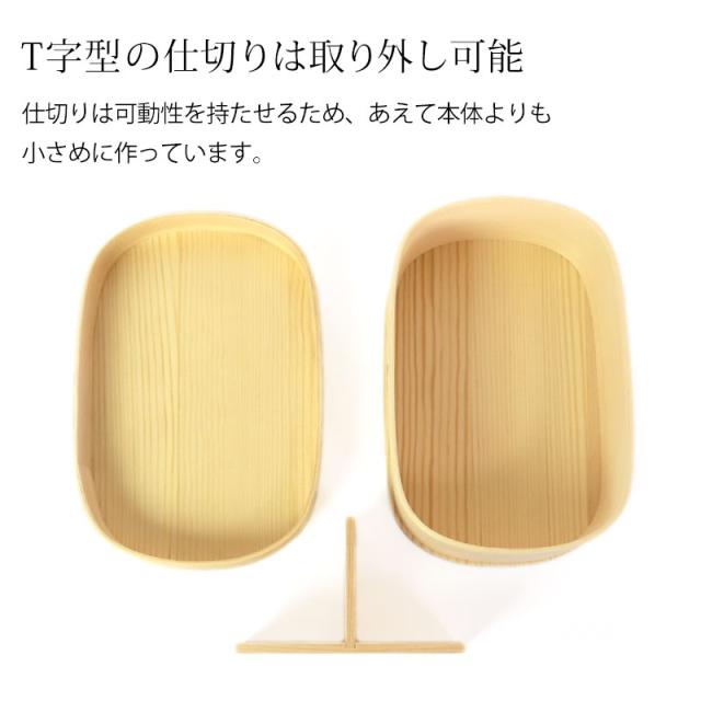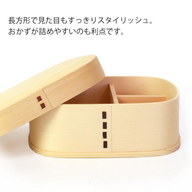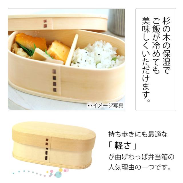 | 商品説明 | 長方形の曲げわっぱのですので、見た目もすっきりスタイリッシュで、おかずが詰めやすいのが利点です。 天然の杉材から加工された木材を職人が一つ一つ丁寧に磨き上げ、手づくりにこだわった安心・安全にお使いいただける逸品です。 曲げわっぱの最大の魅力はお弁当が美味しく食べられることです。 これは木の調湿作用でご飯がベチャっとなりにくく、また通気性が良いのでお弁当の保存に適しているからです。 曲げわっぱは電子レンジ対応していませんが、電子レンジで温めなくても美味しいお弁当が食べられます。 また、食洗機対応ではございませんが、特殊ナノコーティング塗装を施していますので、手洗いで簡単に洗うことができます。 見て懐かしく、でも、今の時代にはモダンに映る「わっぱ弁当箱」手に取ると、軽くて木の温もりを感じるやさしい気持ちに。 ほのかな木の香りが心地よく、懐かしく温かい気持ちになる使い心地。 日本文化のお弁当を曲げわっぱでおしゃれに普段使いに使っていただければ幸いです。 工芸品が身近にあることで、伝統文化の継承につながればと、ささやかながら願っています。 ご入学、ご就職で、新しい生活がはじまります。お弁当箱も新しくして、新鮮な感覚を楽しんでみませんか。 曲げわっぱ杉の木の調湿作用で、ごはんが冷めてもかたくなりにくく美味しく頂けるのが利点です。 自然素材の木のお弁当箱で、ゆっくりと食べるのも良いものです。 おかず仕切り付き。(仕切りは取り外し可能) |