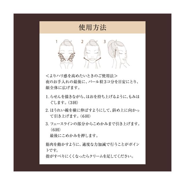 ・夜のお手入れの最後に、パール粒3コ分を目安にとり、顔全体に広げます。