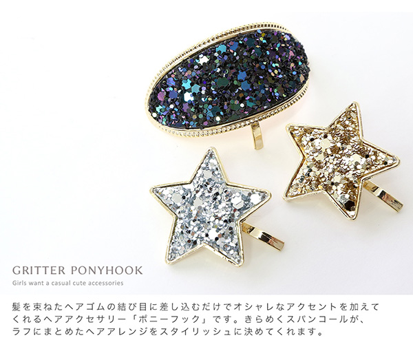 | 髪を束ねたヘアゴムの結び目に差し込むだけでオシャレなアクセントを加えてくれる ヘアアクセサリー「ポニーフック」です。 きらめくスパンコールが、ラフにまとめたヘアアレンジをスタイリッシュに決めてくれます。 | |