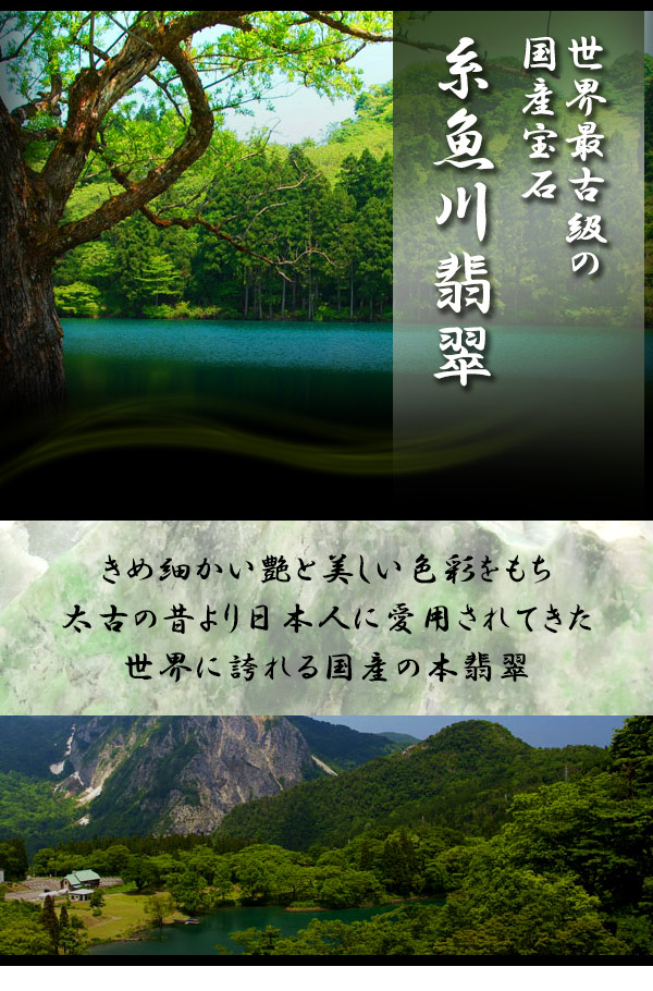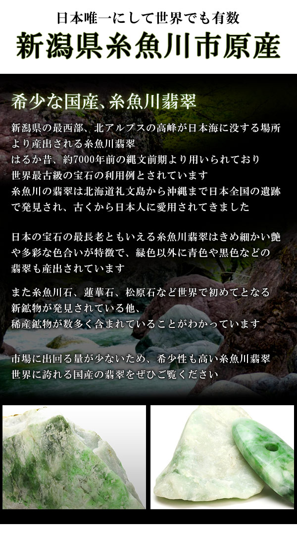 糸魚川産の本翡翠は、日本唯一にして世界でも有数の原産地・新潟県糸魚川市で採掘された翡翠のことです。市場に出回る量が少ないため希少性が高く、中には原石のままでも美しい宝石質の翡翠なども採掘されています。