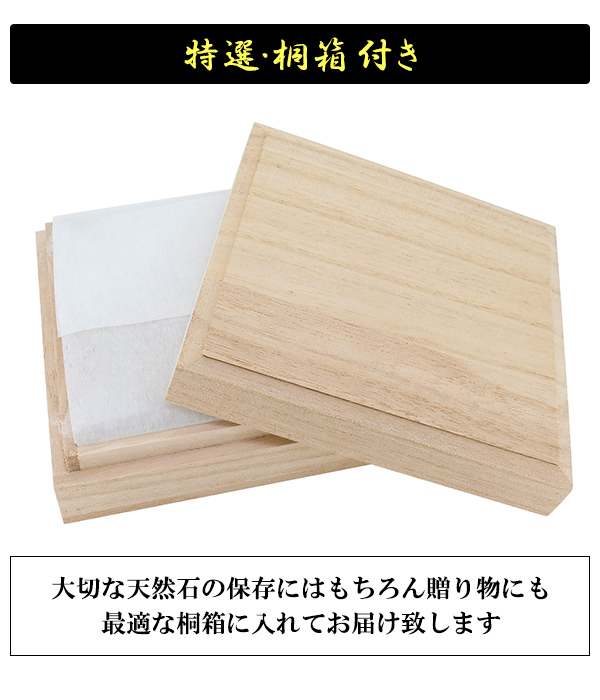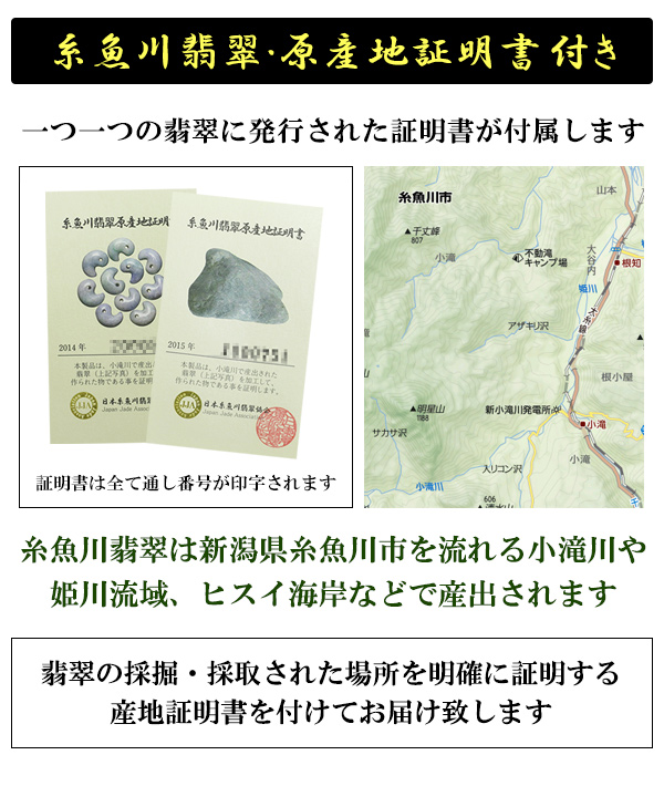 採掘された場所を明確に証明する「原産地証明書」が付属し、翡翠の保存から贈り物にも最適な桐箱に入れてお届けいたします。
