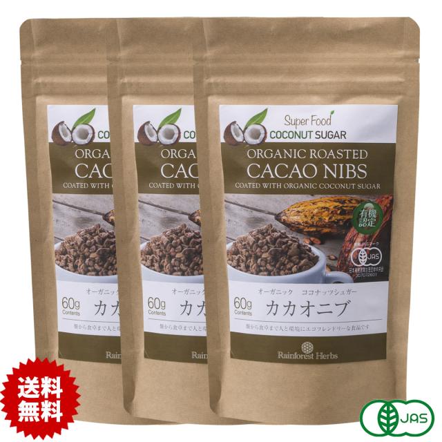 有機カカオニブ ココナッツシュガー味 60g 3袋 ペルー産 有機JASオーガニック 無添加 低糖質 低カロリーシュガーコーティング 砂糖不使用