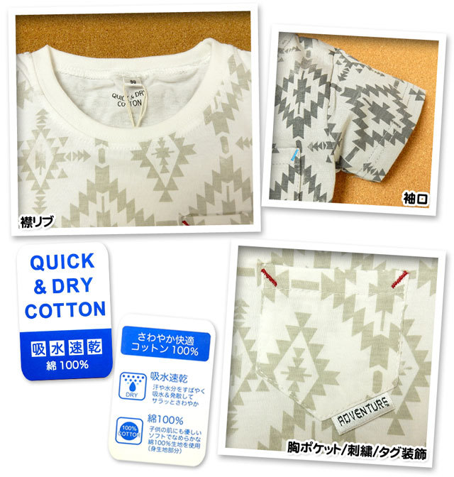 【送料無料】ベビー服 男の子 Tシャツ 半袖 吸水速乾 ネイティブ柄 胸ポケット 刺繍 タグ装飾 男児 ベビー 【メール便対応】