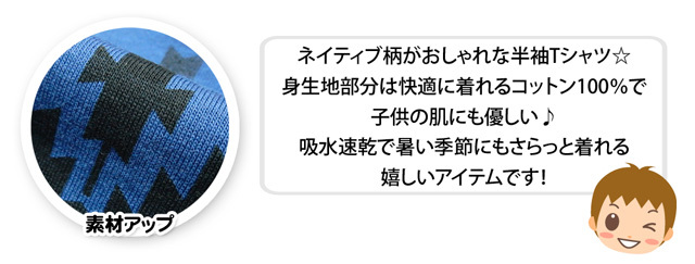 [コメント]ネイティブ柄がおしゃれな半袖Tシャツ☆身生地部分は快適に着れるコットン100%で子供の肌にも優しい♪吸水速乾で暑い季節にもさらっと着れる嬉しいアイテムです!