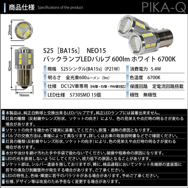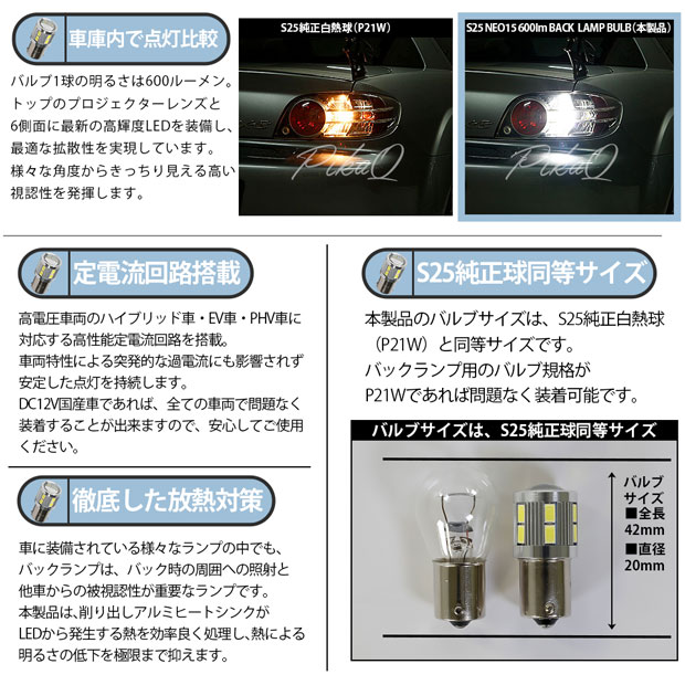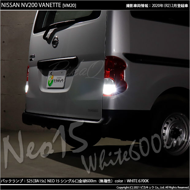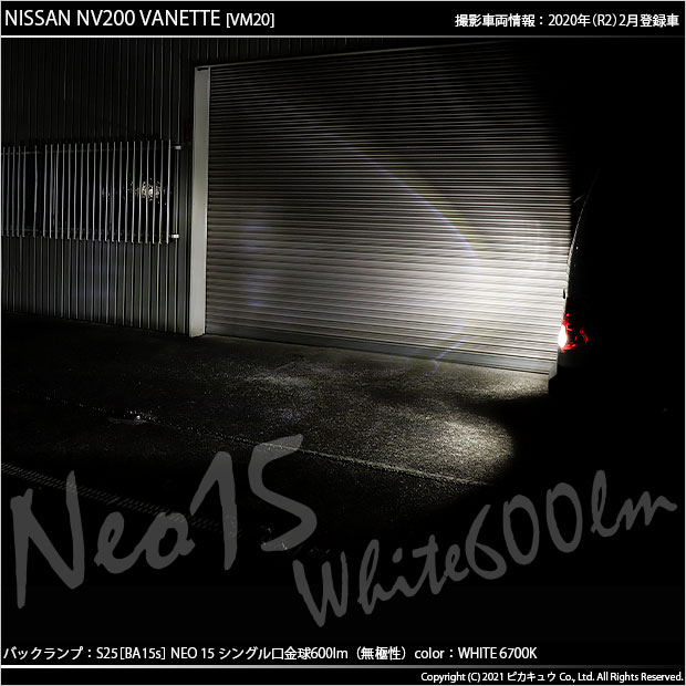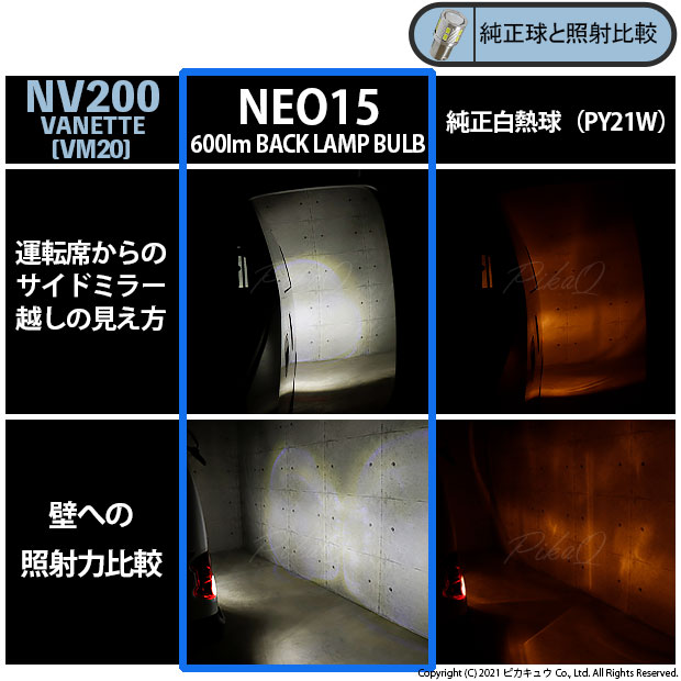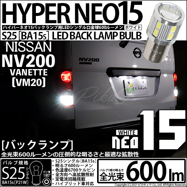 ピカキュウ,LED専門店,LEDバルブ,LED,SMD,BA15s,P21W,S25シングル,ピン角180°,バックランプ,DC12V車,NEO15,ホワイト,全光束600lm,定電流回路搭載,ハイブリッド車対応,ニッサン,NISSAN,nv200バネット,NV200 VANETTE,VM20