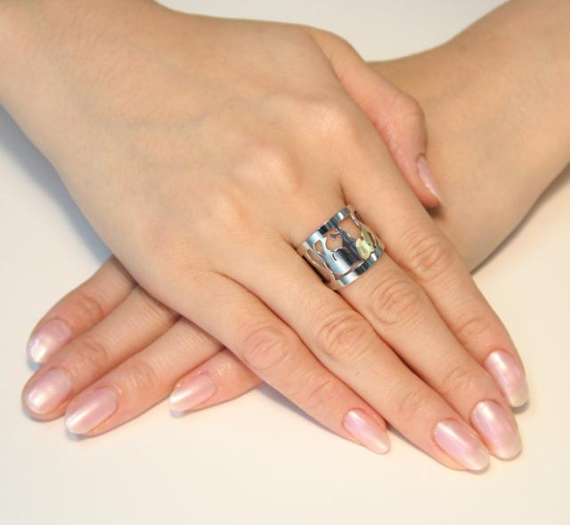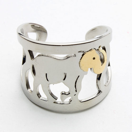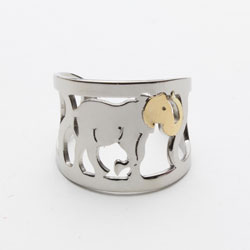 イタリア3大ゴールド生産地の一つ、アレッツォから届いた最新デザインのフリーサイズリング。日本での販売は、当店のみとなっております! 硬く、強く、さびにくい、今イタリアでトレンドのステンレス素材を使用。表面に18金をあしらって高級感のある仕上がりになっています。イタリアならではのモダンなデザインで、存在感がありながら女性らしいエレガントな印象。モチーフとなっている象は、タイやヨーロッパでは昔から幸せを呼ぶ動物と言われています。その言い伝えの通り、象がモチーフのジュエリーは、つけると幸せになるといわれています。指先は人の目に付きやすい、とっても重要なおしゃれポイント!当店でしか手に入らない、イタリア製のお洒落なリングで、ワンランク上のおしゃれをお楽しみ頂けます。●ステンレススチール、18金(貼り付け加工) ●フリーサイズ対応 ●最大幅約16mm●総重量約2.2g
