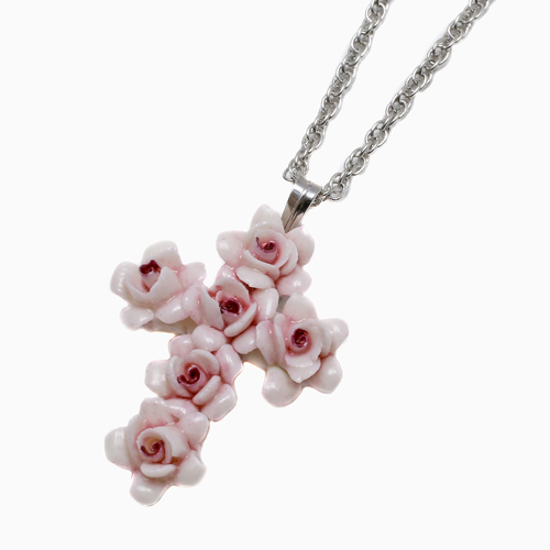 イタリア製 カポディモンテ ペンダント ピンククロス フラワー 十字架