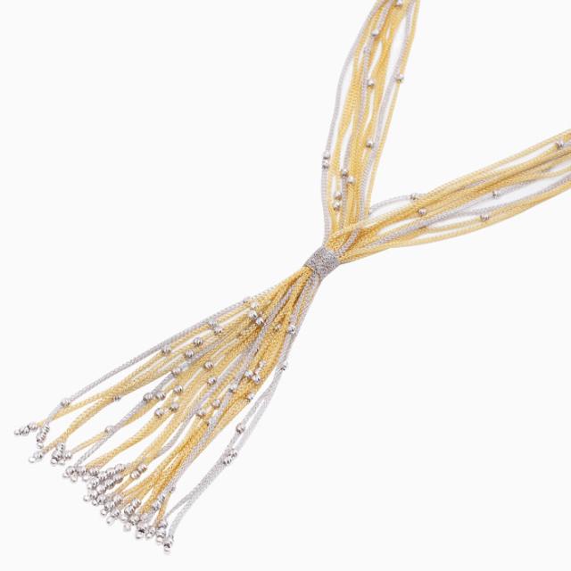 お待たせいたしました。多くの方よりお問合せをいただいておりました、通販のベストヒットネックレスが入荷いたしました。■イタリアの金製品3大生産地の一つ、ヴィチェンツァにあるDIBI社の商品。■イタリア製■シンプルでありながら、華のあるゴージャスなデザインは、20代からハイミセスまで、幅広い年齢でお使いいただけます。●シルバー925(金、ロジウムメッキ仕上げ) ●長さ約50cm(ふさの部分別に約10cm) ●最大幅約8mm●総重量約26g(多少前後します) ●留具はフック式