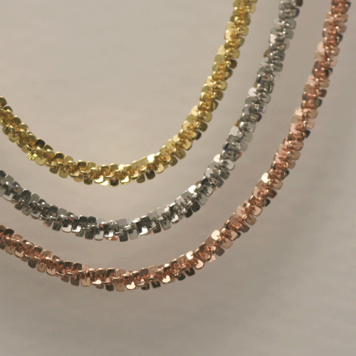 ■イタリアのDIBI社の商品。イタリアならではのクリスクロスチェーンはキラキラと輝きお持ちのどんなトップにも容易に合わせることができます。もちろん、十分なボリュームがあるのでそのままネックレスとしてもお使いいただけます。重ね着けにもお勧めです。■イタリア製■シンプルでありながら、カットの輝きが華を添えるデザインは、20代からハイミセスまで、幅広い年齢でお使いいただけます。●シルバー925(ピンクゴールドメッキ仕上げ) ●長さ約43cm(アジャスター5cm含む)●最大幅約1.8mm●総重量約5g ●留具はフック式