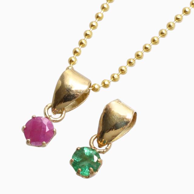 プチサイズが可愛いルビーとエメラルドのペンダントが登場!ルビーは人気の愛らしいレッドカラー、エメラルドは神秘的なグリーンで共に輝きが美しく胸元での存在感は抜群です!!キラキラと輝くイタリアのカットボールチェーンは、胸元を明るく、綺麗に見せてくれる効果があります。また、アジャスターがあるので長さをお好みに調節が可能!どんなスタイルにも合わせやすい2色のペンダントは、大活躍すること間違い無しです!【素材】・トップ:ルビー/エメラルド・バチカン:18金(K18)・チェーン:SV925(ゴールド仕上げ)【チェーン】・イタリア製SV925カットボールチェーン(ゴールド仕上げ)・長さ/約45cm(約7cmのアジャスター込)・留具は引輪式 【トップの大きさ】・縦約10mm×横約3.5mm(バチカン込)【ルビー・エメラルド】各約0.15カラット【総重量】・合計約0.4g(トップ2つ分の重さ) 日本製 ※こちらの商品はトップ2個とチェーン1本のセットです。※天然石を使用しておりますので、石の色合いや輝きが写真と多少異なる場合がございます。※天然石のため、肉眼で確認できるキズや内包物がございます。
