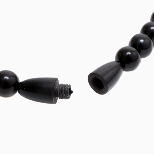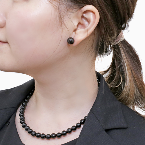 パールよりも控えめで落ち着きのあるジェットのネックレスは、喪の席に最適のジュエリーと言われているんですよ。8mm珠使用のネックレスでありながら、重さ約19gと、とっても軽いので着けていても気になりません。喪の席はもちろん、シンプルで使いやすいデザインは普段のおしゃれにも最適!ひとつ持っていればとても安心。特別な時のために揃えておきたいジュエリーです☆天然ジェット(約8mm球、約10mm珠)●ネックレス約8mm珠/長さ約42cm、重さ約19g、留具=ねじ込み式(牛の角)●ピアス約10mm珠/重さ約1g(片方0.7g)、留具=キャッチ式(チタンポスト)●日本製 ※天然素材のため表面に凸凹が見られる場合がありますがキズではありません。ご了承ください。