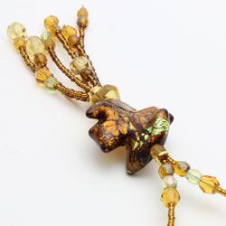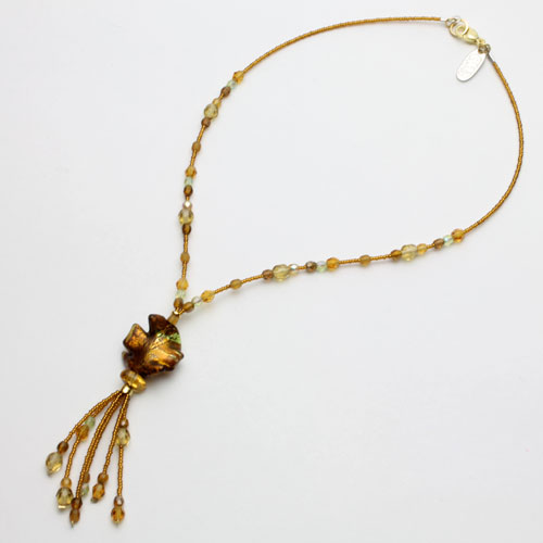 イタリアの最先端ファッションの都「ミラノ」。そこで活躍するジュエリーデザイナーのアヴェ・テッタマンティ。ベニスの熟練職人によるベネチアンガラスを使い洗練されたデザインセンスとイタリア人ならではの色使いを持ち合わせ、イタリアはもちろん世界中の大人の女性たちを魅了しています。彼女の作品は決して派手すぎずそれでいて絶対的な存在感があり、どんな服装にもコーディネートしやすいように考えられています。人気のYタイプを気軽にブラウン系の色合いとシェルシェイプ。ベネチアンガラス、樹脂を絶妙なバランスで使い、ボリューム感と軽い着け心地を実現。長さも合わせやすい約45cm。これからの季節、プレゼントにもぴったりですよ。