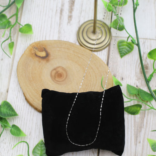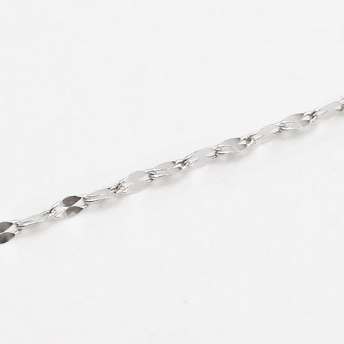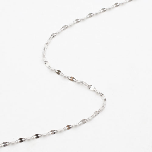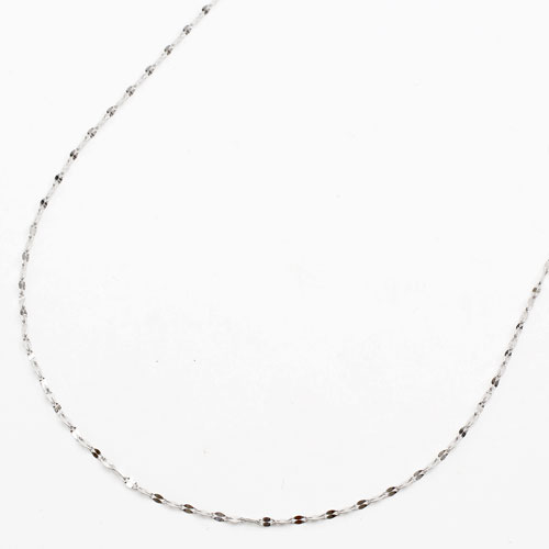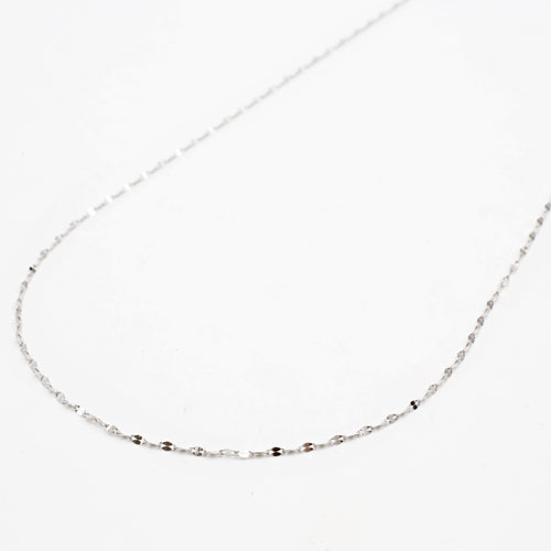 高級素材である、18金ホワイトゴールド(K18WG)を惜しみなく使用した、きらきらネックレス。決して華やか過ぎない、洗練されたデザインのネックレスは、落ち着いた大人の女性にぴったりです。普段の装いをぐっとエレガントに引き立ててくれます。50cmまでのお好みの長さに調整できるシリコンボール付でサイズで、ペンダント用のチェーンとしても長さのアレンジが容易にでき、また、そのままでも繊細ですがキラキラの存在感のある魅力的なチェーンです。また、プレート部分には、「K18WG(刻印)」が有り、素材と品質の良さも証明されています。【素材】18金ホワイトゴールド【サイズ】長さ/約45cm、最大幅/約1mm【重さ】約0.8g 【留具】引輪式 【仕様】K18WG 刻印入