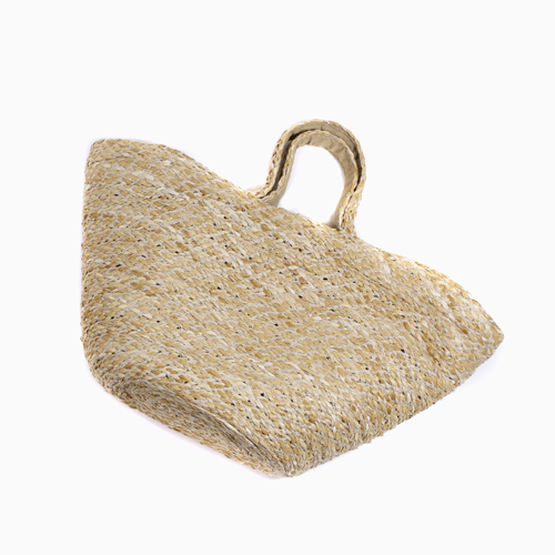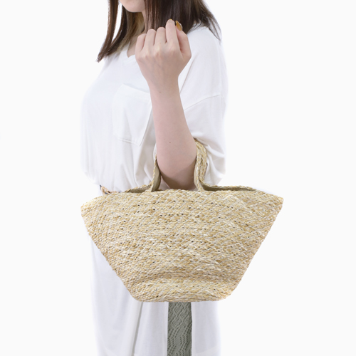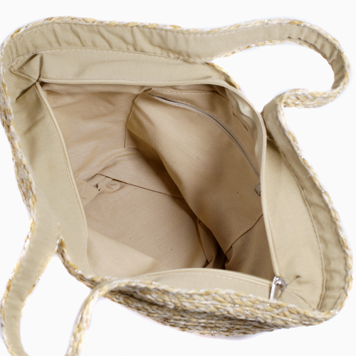 インド麻編みかごバッグです。★グリッターメタルを織り込んで、キラキラ感と大人っぽい高級感を演出しています。バッグの口が広く荷物の出し入れがしやすく、たっぷりと収納でき、荷物の多い方にも最適です。ジッパーを開けると、コットン100%の内素材に携帯や小銭入れなどを収納できるジッパー付の小さなポケットが一つ付いています。このトート型のかごバッグは、「かご」と言っても硬くなく、しなやかに編んでありますので、電車や人ごみでもあまり気にしなくていいのもうれしいです。バッグ自体、軽量なのもGOOD♪色もベージュとどんな服装にも合わせやすく、水着やビーチサンダルと組み合わせてもオシャレですのでリゾート地でも大活躍すること間違いなしです!!素材の性質上、海水の付着、衣類のひっかけ等には十分ご注意下さい。●