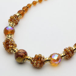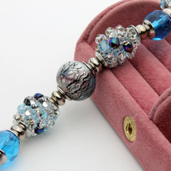 イタリア・ムラーノ島で、マエストロと呼ばれる熟練した職人たちが、べネチアンガラスの伝統の技法を用い一つ一つ丁寧に手作りしています。その美しい模様は、芸術品とまで称されるほど。手作りのため、まったく同じものは2つとなく、世界にたった一つのあなただけのネックレスといえます。そのベネチアンビーズガラスを使って、ミラノで人気の若手アクセサリーデザイナー・キアラ(CHIARA)がおしゃれでわくわくする感性のネックレスを作りました。ブルー系に銀箔色を配した落ち着いた大人の色使い、大胆にでも決して派手ではなく日本の女性に気軽に着けてもらえるように考えたそうです。べネチアンガラスの花が美しく咲き誇る、とってもおしゃれなネックレス。頑張った自分へのご褒美に、また記念日のプレゼントにもぴったりです。※職人