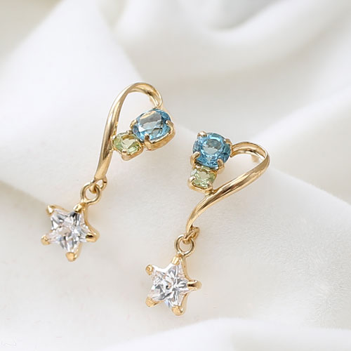 肌馴染みの良いイエローゴールドの天然石が美しいピアス!!素肌まで奇麗に魅せてくれる大人ジュエリー。耳元でさりげなく揺れ、存在感はあるのに、スッと馴染むから上品なアクセントになり女性の魅力を引き立ててくれます。デイリーにはもちろん、パーティーやニ次会の席にもおすすめです!●素材:10金イエローゴールド、キュービックジルコニア、ブルートパーズ、ペリドット●留具:キャッチ式●長さ約:10.5mm×6mm(ポスト部分10mm) ●総重量約0.3g×2(キャッチ込) ●刻印「K10」●日本製