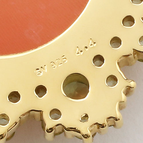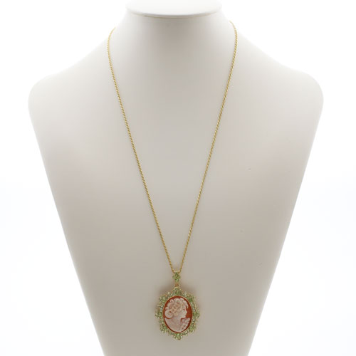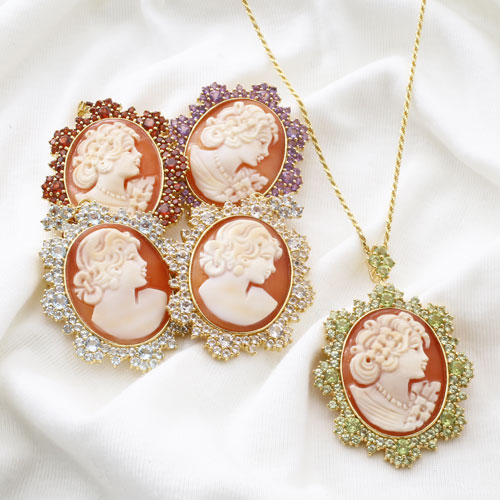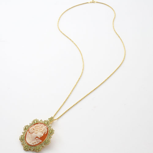 きびしい基準のカラーストーン選別と品質管理のバンコクにあるプランダジュエリー製。チェーンを外してブローチとしてもお使いいただけるようにバチカン部分を内側に収納できるようになっています。【素材】●イタリア製手彫シェルカメオ、天然ペリドット (合計4.4カラット) ●シルバー925(ゴールドメッキ仕上げ) 【カットロープチェーン】●長さ/約50cm ●留具は引輪式、風車式(ブローチ) 【トップの大きさ】約縦54×横35mm(バチカン込) 【総重量】 ●約15g(トップ部分) 【ご注意】手彫りのシェルカメオを使用していますので、女性の顔や髪型などはそれぞれ異なります。また、天然の貝の為、色の濃淡やそれぞれ模様が違います。写真と同じものはお届けできませんので予めご了承ください。