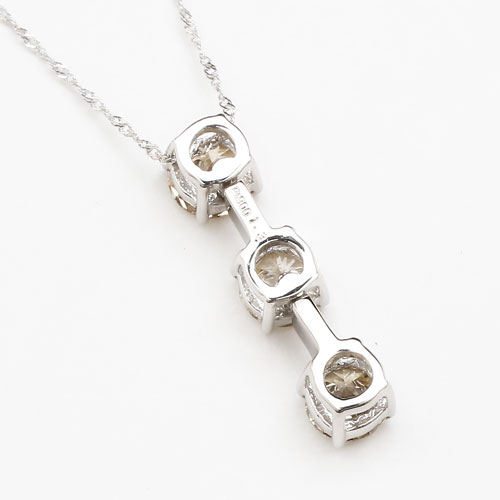 定番の人気デザイン、スリーストーンダイヤモンドペンダント! 3個のダイヤモンドには過去・現在・未来と永遠に変わりない愛のメッセージが込められています。ダイヤモンドは、輝きのあるI1クラス以上のライトブラウン系カラーを使用。3石の合計がなんと1.3カラットにもなる、大変豪華なボリュームのある仕様です。トップ部分の地金には、高級素材のプラチナ900を贅沢に使用した、とてもしっかりとした枠になっています。また、チェーンにもプラチナ850のスクリューチェーンを使用しています。【素材】●トップ/プラチナ900●チェーン/プラチナ850 【チェーン】スクリューチェーン●長さ約40cm(引輪より約3cm部分にアジャスター有)留具は引輪式【トップの大きさ】約縦30×横5mm 【ダイヤモンド】3石合計約1.3カラット(I1クラス以上、ライトブ