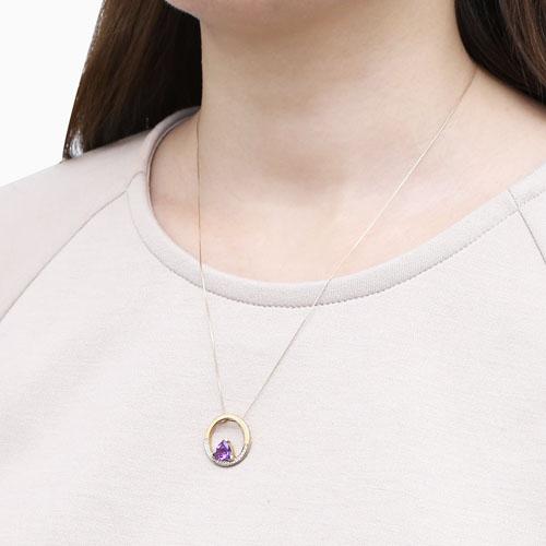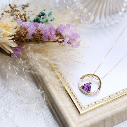 バンコクにあるプランダジュエリーはタイで3本の指に入るジュエリー生産量を誇り世界中に輸出しています。 最上な教育を受けた優秀なデザイナーたちが自らの感性を自由に表現し、他社にない魅力的なジュエリーが誕生しています。厳格なカラーストーンの選別と品質管理が世界一厳しい日本でいつまでも愛されるジュエリー。地金部分には10金(K10)を使用し、天然石のアメジストの輝きがエレガントな雰囲気を演出。服装を選ばずデイリーにお使い頂けます。