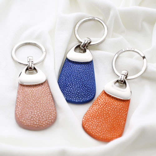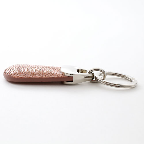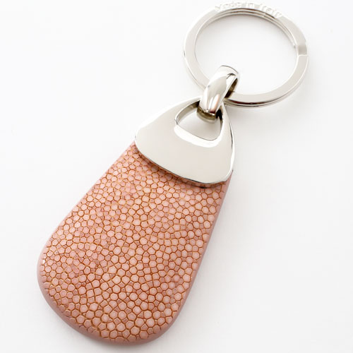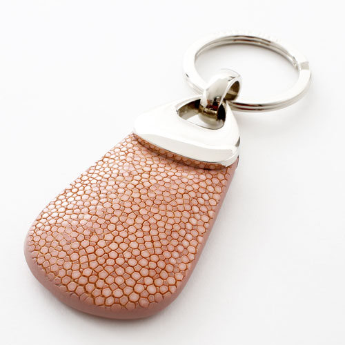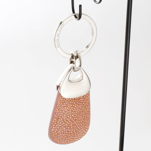 上品な色合いのピンクでかわいく、大人っぽいキーホルダーはプレゼントにもおすすめです。【素材】*エイ革(ガルーシャ)、*真ちゅう【重さ】*約29g【サイズ】*約6.7cm(キーリング込約10cm)×3.5cm【仕様】*刻印『Maid in Italy』*防水性あり、*イタリア製 ※一つ一つ職人によるハンド