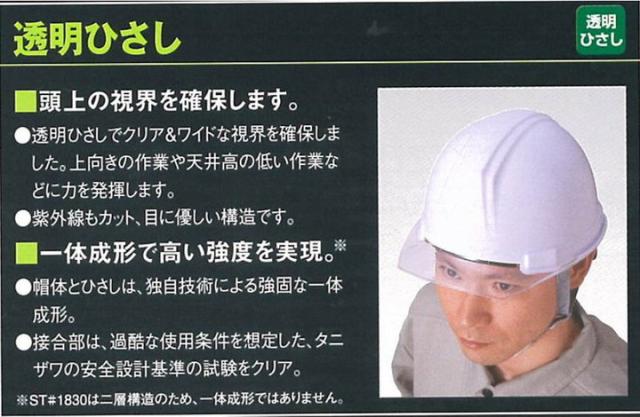 透明ひさしでクリア&ワイドな視界を確保しました。上向きの作業や天井高の低い作業などに威力を発揮します。紫外線もカット、目に優しい構造です。一体成形で高い強度を実現。