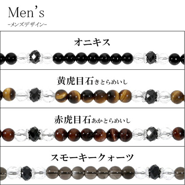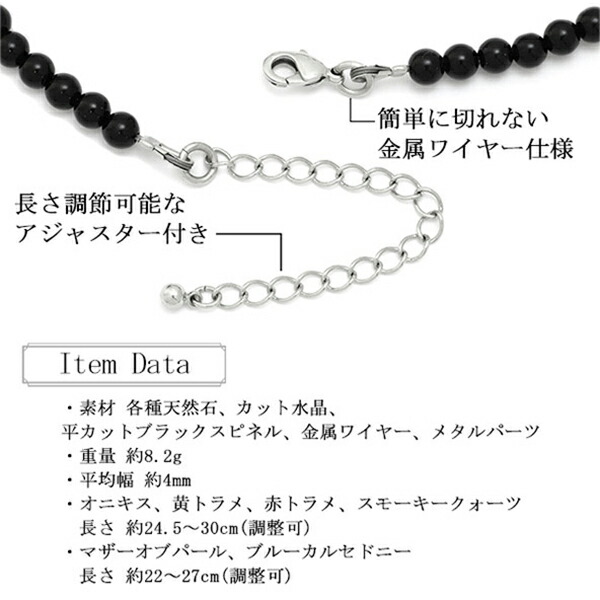 ・素材 各種天然石(オニキス、黄トラメ、赤トラメ、スモーキークォーツ、マザーオブパール、ブルーカルセドニーのいずれか)、カット水晶、平カットブラックスピネル、金属ワイヤー、メタルパーツ