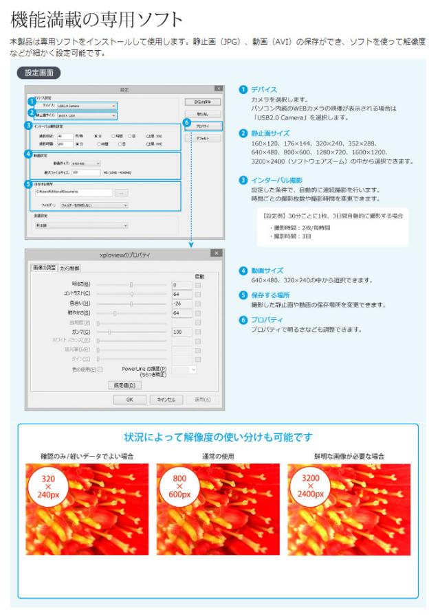 光学倍率最大250倍まで拡大できるパソコン用USB顕微鏡です。撮影台を兼ねた専用台座を付属しています。スタンドのアームは自由自在に曲げることができるフレキシブルアームです。プリント基板や印刷物の確認、自由研究などの教育向けにも最適です。被写体を照らす高輝度LED付きで、手元のダイヤルで明るさが調整できます。手元で撮影できるスナップショットボタンが付いています。<注意事項>※被写体にレンズ部をぴったりつけている場合、高倍率と低倍率の2ヶ所でピントが合います。※光学ズームの倍率は画面上では表示されません。※任意の倍率で対象物を見ることはできません。※本製品で2Mの解像度で画像を撮影し、解像度1920×1080ピクセルに設定した24インチモニタで表示した場合、約400倍になります。