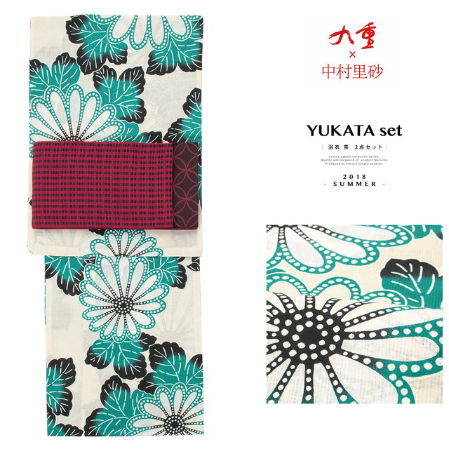 浴衣セット レディース レトロ 浴衣セット 大人 2点セット 白系 アイボリー 青緑色 グリーン マゼンタピンク 菊 花 綿麻 女性 九重×中村里砂 フリー