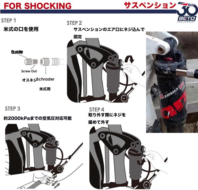 サスペンションのエア圧調整時にはアダプタを外して米式の口を使用します。