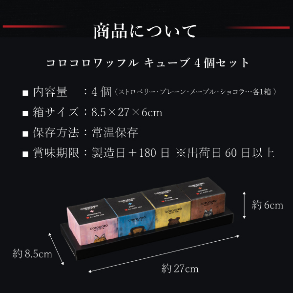 ●内容量:プレーン、メープル、ストロベリー、ショコラ各1箱 (箱サイズ:約85mm×270mm×60mm、1個サイズ:約60mm×約60mm×約60mm)