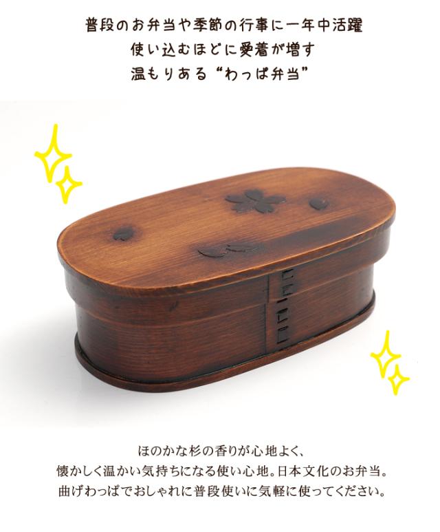 | 普段のお弁当や季節の行事に一年中活躍、使い込むほどに愛着が増す温もりある“わっぱ弁当”。ほのかな杉の香りが心地よく、懐かしく温かい気持ちになる使い心地。日本文化のお弁当、曲げわっぱでおしゃれに普段使いに気軽に使ってください。桜の木の皮を使い、お弁当の蓋に桜の花びらをあしらいました。自然の木の皮ですので、それぞれ模様が異なり個性があります。杉の木の調湿作用でごはんが冷めても美味しく頂けます。ご飯がかたくなりにくく、レンジで温めなくても美味しいお弁当が味わえるのが、曲げわっぱの最大の魅力です。お弁当箱本体が非常に軽く、わずか約150gほどです。荷物が多くなっても、若干でも負担が軽減されると思います。通学、通勤やなど、普段の持ち歩きにも優しいですね。木目が可愛くて、杉の香りがほのかに漂い、とてもリラクゼーションさせてくれます。見て懐かしく、でも、今の時代にはモダンに映る「わっぱ弁当箱」。手に取ると温もりを感じるやさしい気持ちになります。ご入園、ご入学、ご就職で、新しい生活がはじまる場面があるかと思います。お弁当箱も新しくして、曲げわっぱでランチタイムを楽しんでみませんか。自然素材の木のお弁当箱で、ゆっくりと食べるのも良いものです。?入学、就職祝いなどの新生活ギフトにも好評です。 |