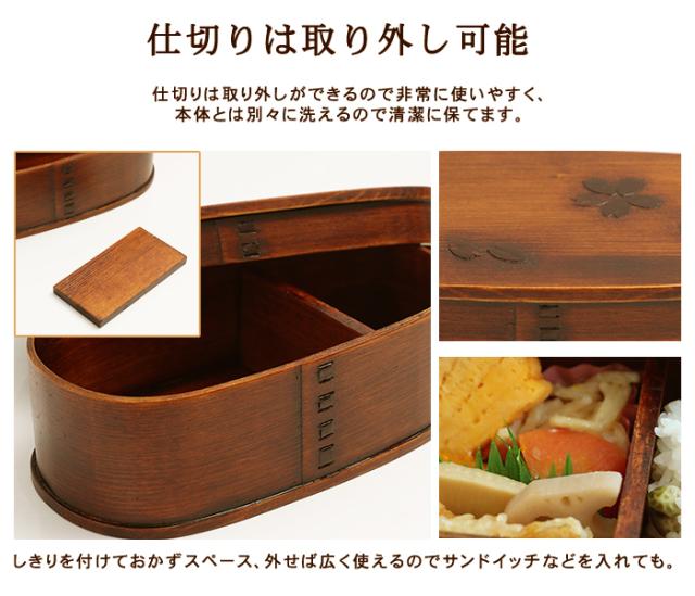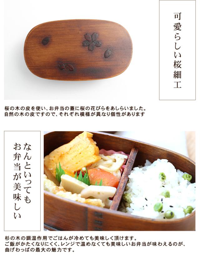 日本文化のお弁当、曲げわっぱでおしゃれに普段使いに気軽に使ってください。桜の木の皮を使い、お弁当の蓋に桜の花びらをあしらいました。自然の木の皮ですので、それぞれ模様が異なり個性があります。杉の木の調湿作用でごはんが冷めても美味しく頂けます。ご飯がかたくなりにくく、レンジで温めなくても美味しいお弁当が味わえるのが、曲げわっぱの最大の魅力です。木目が可愛くて、杉の香りがほのかに漂い、とてもリラクゼーションさせてくれます。見て懐かしく、でも、今の時代にはモダンに映る「わっぱ弁当箱」。手に取ると温もりを感じるやさしい気持ちになります。ご入園、ご入学、ご就職で、新しい生活がはじまる場面があるかと思います。お弁当箱も新しくして、曲げわっぱでランチタイムを楽しんでみませんか。自然素材の木のお弁当箱で、ゆっくりと食べるのも良いものです。?入学、就職祝いなどの新生活ギフトにも好評です。お弁当箱 小判型 弁当箱 白木 和風 男子 大容量 女子 大人 子供 女の子 男の子 スリム おしゃれ 運動会 遠足 麺 丼 木製 送料無料