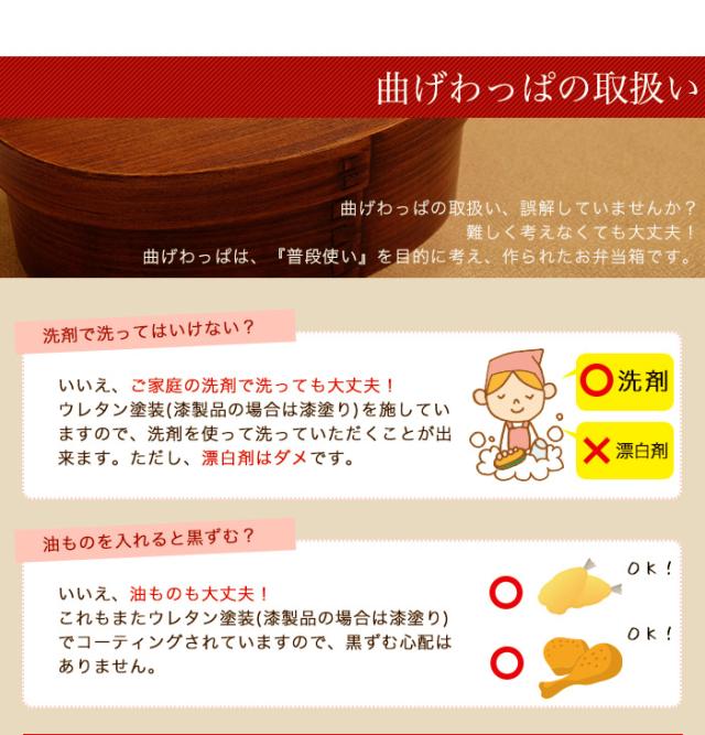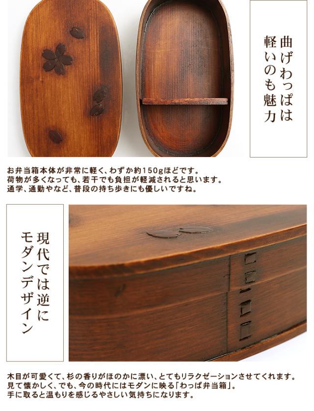 - ず〜っと「曲げわっぱ」欲しい欲しいと思っていました。蓋に桜の皮のはめ込みのデザインがなんともかわいい、やっと欲しいという物に出会い購入。 軽さにびっくりと、いつものおかずが、なんとも美味しそうに見える。サイズ凄く迷いましたが、少食の私にはピッタリ。きっと、中高校生の女子にピッタリと思います。この、「桜わっぱ」に合うお箸もセットで売っていたら嬉しいです。