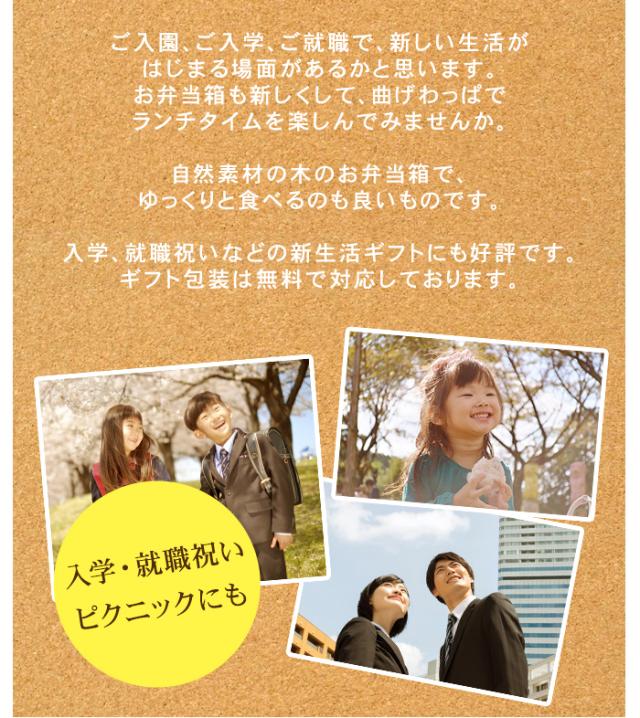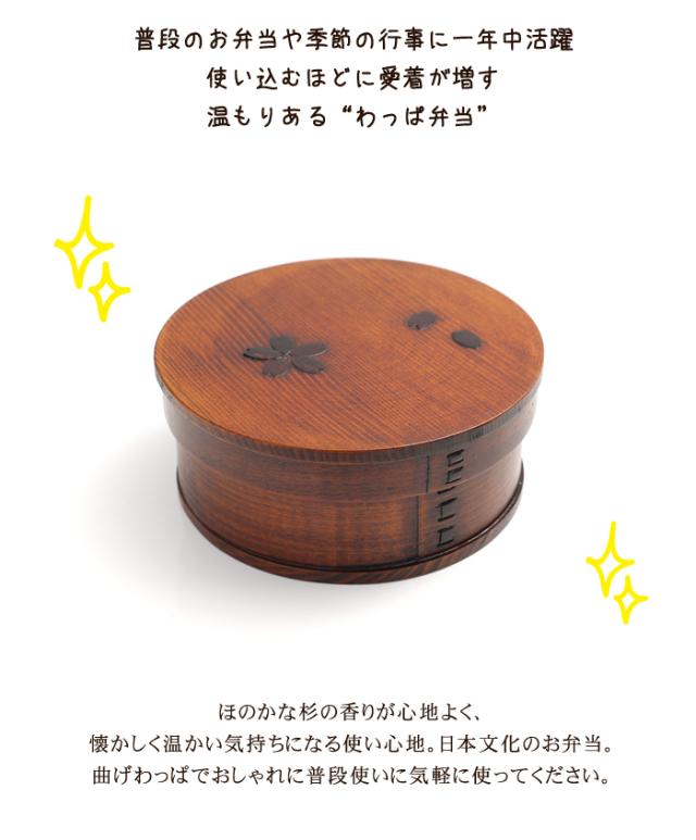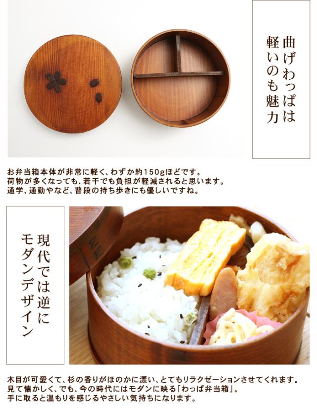 | 普段のお弁当や季節の行事に一年中活躍、使い込むほどに愛着が増す温もりある“わっぱ弁当”。ほのかな杉の香りが心地よく、懐かしく温かい気持ちになる使い心地。日本文化のお弁当、曲げわっぱでおしゃれに普段使いに気軽に使ってください。桜の木の皮を使い、お弁当の蓋に桜の花びらをあしらいました。自然の木の皮ですので、それぞれ模様が異なり個性があります。杉の木の調湿作用でごはんが冷めても美味しく頂けます。ご飯がかたくなりにくく、レンジで温めなくても美味しいお弁当が味わえるのが、曲げわっぱの最大の魅力です。お弁当箱本体が非常に軽く、わずか約150gほどです。荷物が多くなっても、若干でも負担が軽減されると思います。通学、通勤やなど、普段の持ち歩きにも優しいですね。木目が可愛くて、杉の香りがほのかに漂い、とてもリラクゼーションさせてくれます。見て懐かしく、でも、今の時代にはモダンに映る「わっぱ弁当箱」。手に取ると温もりを感じるやさしい気持ちになります。ご入園、ご入学、ご就職で、新しい生活がはじまる場面があるかと思います。お弁当箱も新しくして、曲げわっぱでランチタイムを楽しんでみませんか。自然素材の木のお弁当箱で、ゆっくりと食べるのも良いものです。?入学、就職祝いなどの新生活ギフトにも好評です。 |