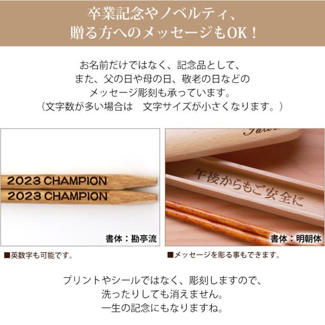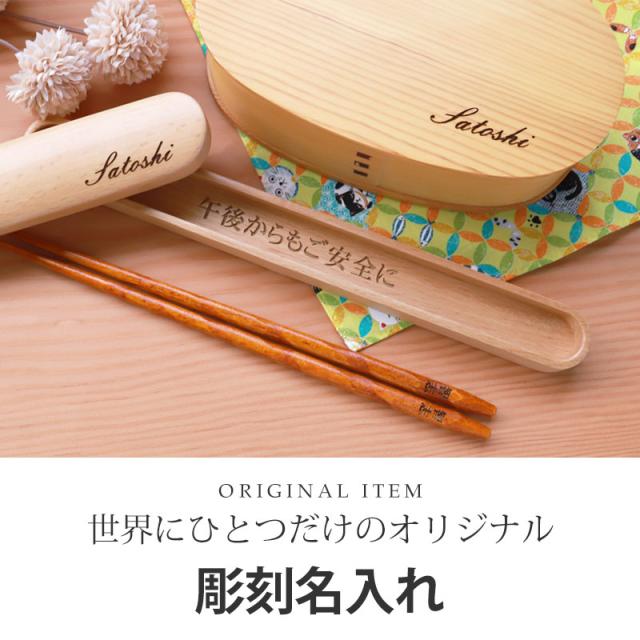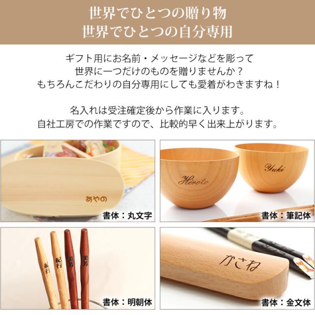 | 商品説明 | ★名前を彫ると、世界にたった一つのオリジナル品に! ギフト用にお名前・メッセージなどを彫って世界に一つだけのものを贈りませんか? もちろんこだわりの自分専用にしても愛着がわきますね! ほとんどの商品に彫刻名入れできます。 (木製、プラスチック製など) ≪彫刻名入れをご利用頂くおすすめの例≫ ★御結婚の御祝いに新郎新婦のお名前を ★御出産の御祝いにベビーのお名前を ★入園・入学・卒業の御祝いに ★父の日・母の日・敬老の日 ★披露宴で席札代わりに、彫刻名入れ箸をセッティング ★お店・会社の名前を彫ってノベルティー・記念品に。 |