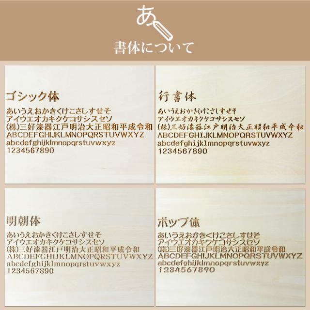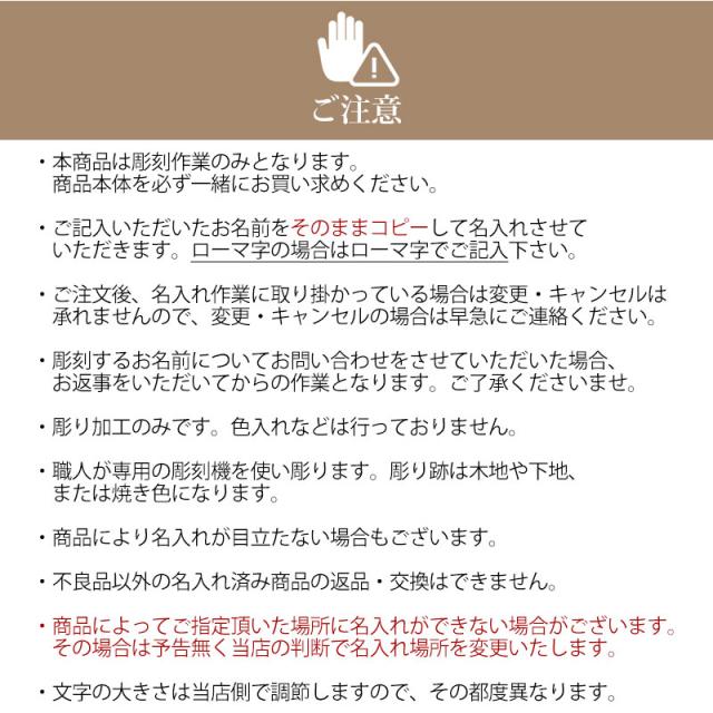 ・本商品は彫刻作業のみとなります。商品本体を必ず一緒にお買い求めください。 ・ご記入いただいたお名前をそのままコピーして名入れさせていただきます。 ローマ字で名入れする場合は「英字」で大文字、小文字などご希望合わせてご記入ください。 ・ご注文後、名入れ作業に取り掛かっている場合は変更・キャンセルは承れませんので、変更・キャンセルの場合は早急にご連絡ください。 ・彫刻するお名前についてお問い合わせをさせていただいた場合、お返事をいただいてからの作業となります。ご了承くださいませ。 ・彫り加工のみです。色入れなどは行っておりません。 ・職人が専用の彫刻機を使い彫ります。彫り跡は木地や下地、または焼き色になります。 ・商品により名入れが目立たない場合もございます。 ・不良品以外の名入れ済み商品の返品・交換はできません。 ・商品によってご指定頂いた場所に名入れができない場合がございます。 その場合は予告無く当店の判断で名入れ場所を変更いたします。 ・文字の大きさは当店側で調節しますので、その都度異なります。 |