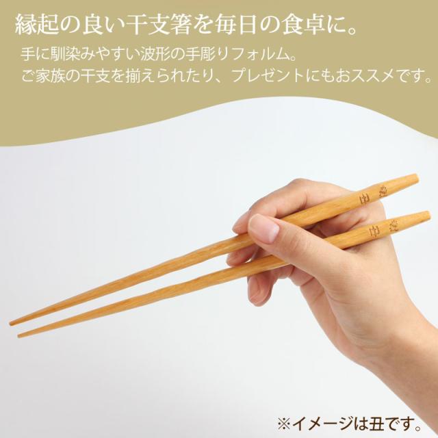 | 商品説明 | みよし漆器本舗オリジナル商品です。 日本古来の干支を数える風習は、そのまま健康を祈る風習でもあります。 縁起物の干支を可愛い絵柄にして彫りました。 家族揃って新しい干支箸で新年をお迎えください。 また大切な方へのプレゼントにもおすすめです。 波形の手彫りフォルムですので、初めての手にもすぐになじみます。 箸先は当店一押しの先角仕上げです。箸先が四角形になっていますので、細かな物でもつかみやすいです。 他の干支箸や、お得な5本セットもお取り扱いしております 日本国内加工品 |