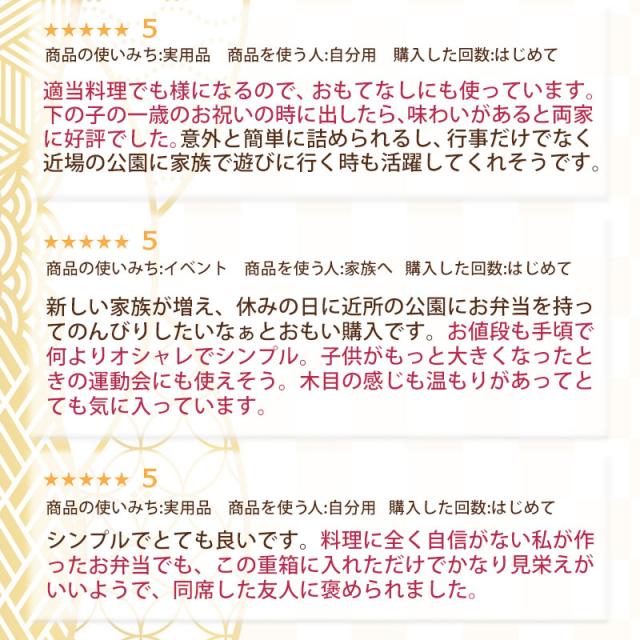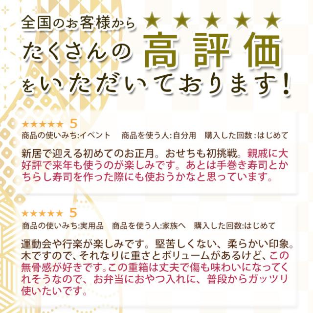 - 今年は重箱を新調しようと、あちこちのショップを見て決めました。画像では漆の色が明るい感じでしたが、濃いめの私好みの色で大満足!これが手作り?と思うくらい丁寧で高級感があります。永年使えるようにお手入れ頑張ります! ありがとうございました\(^-^)/
