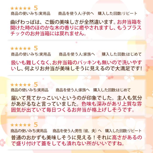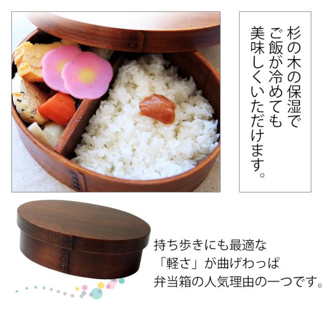 | 商品説明 | 漆を何度も摺りこんで仕上げ、使い込むほどに風格を増していく逸品です。 杉の木が保湿をしますので、ごはんが冷めてもかたくなりにくく美味しく頂けます。末永くお使いください。 大きめのサイズですので、働く男性用にオススメです。 当店の一段弁当箱の中で最大容量(900ml)です。 おかず仕切り付き。(仕切りは取り外し可能) さらに当店ではランチバンドもお付けしますので、携帯に最適です。 曲げわっぱは、ごはんが冷めてもかたくなりにくく美味しく食べられると好評です。 ご入学、ご就職で、新しい生活がはじまります。お弁当箱も新しくして、新鮮な感覚を楽しんでみませんか。 自然素材の木のお弁当箱で、ゆっくりと食べるのも良いものです。 T字仕切り付き |